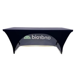 NEW Premium Fabric used as of July 11, 2024. Our New premium weight is 260gsm with upgraded finishing. This form-fitting throw has a clean look to it and is the perfect option for promoting your brand. It stretches to fit tightly around tables, creating a crisp, refined appearance. New pattern for the Open Back gives this tablecloth a fresh, appealing look. Stand out from the competition at tradeshows with these clean look, stretch fit table covers. Three-sided table cover creates a lasting impression. Two-way Stretch Fabric. Simple storage. Open back makes it easy to hide materials underneath table. Lightweight, convenient for travelling and shipping. Usage: Presentations, trade shows, retail stores, events, school functions, fundraisers. Price includes full color imprint. Max Imprint: 127”W x 85”H