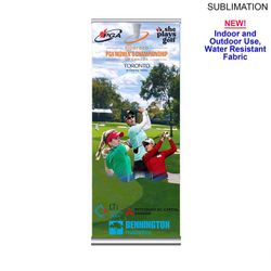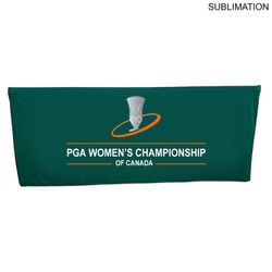 Ideal Outdoor Event Package 2 (DELUXE outdoor pull up banner and PREMIUM sublimated box fit tablecloth for 6' table closed back). Robust and easy to setup. For the deluxe base outdoor pull up retractable banner, we have Sublimated Heavy Fabric Graphics (not Vinyl) using our premium fabric 290gsm, 600D, Water Resistant. It can be used outdoors (with additional weights depending on the elements) and indoors. WOW! No fear of fabric scratching like vinyl does, its environmentally friendly, fabric graphics can be spot cleaned, and same old super quick setup for this pull up banner. Premium Sublimated Box Fit Closed back tablecloth for a 6' table makes it easy to hide materials underneath table and box fit keeps the tablecloth intact against outdoor elements. Table cloth is machine washable and wrinkle resistant. Usage: Golf Tournaments, Outdoor Events, Outdoor fairs, Registration desks, Events, Offices. Price includes full color graphics on both banner and table throw. Max Imprint: Banner: 33.5" x 79"L ; Table Cloth: 72" x 30" x 29" x 29".