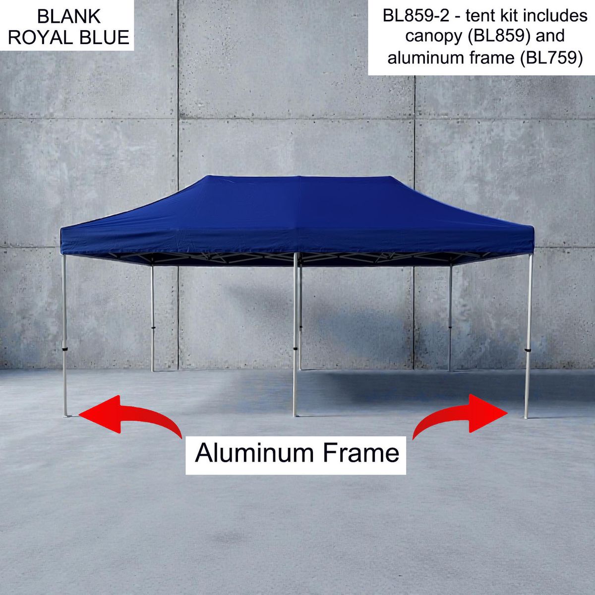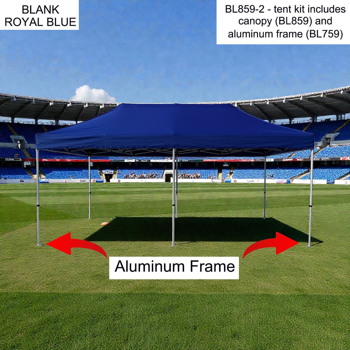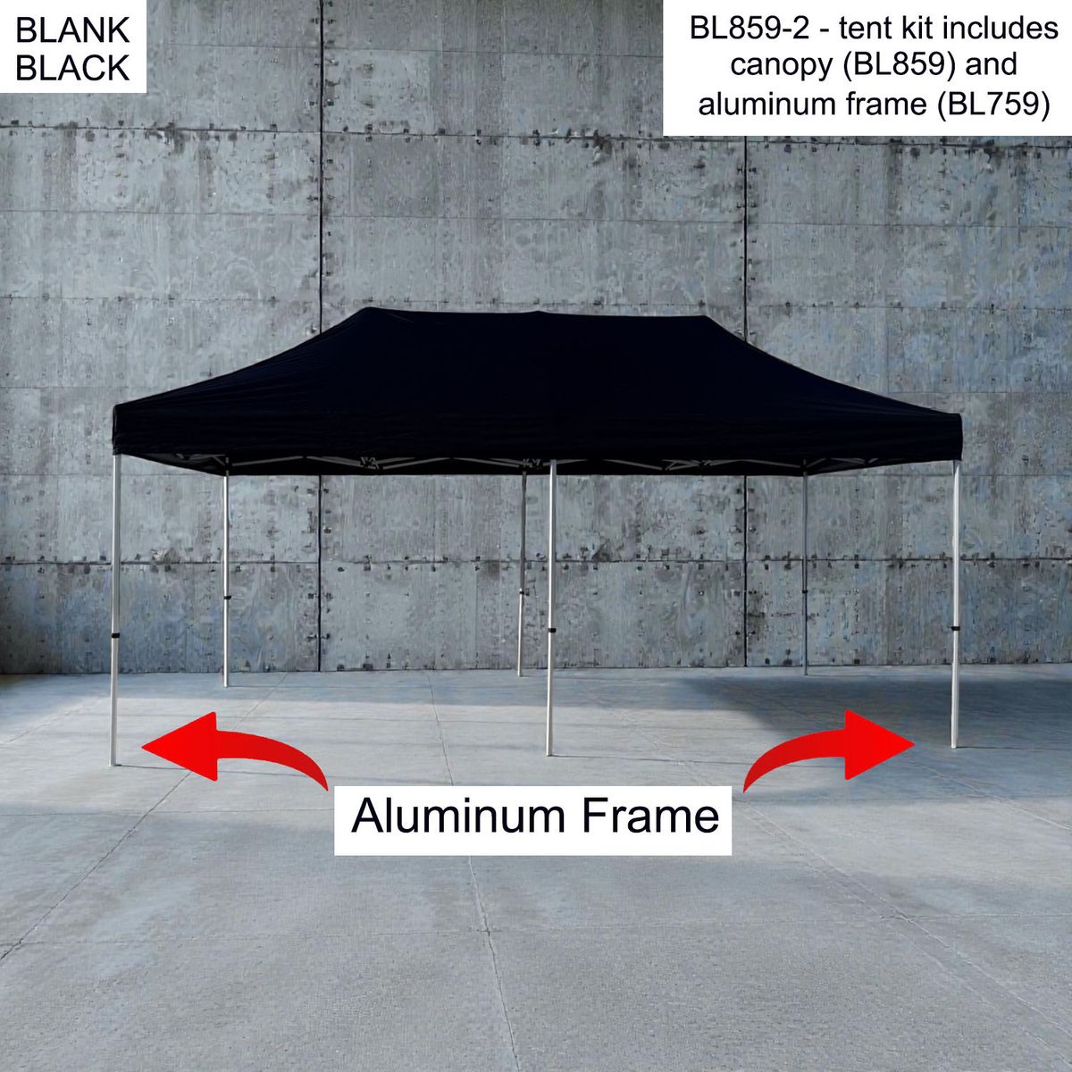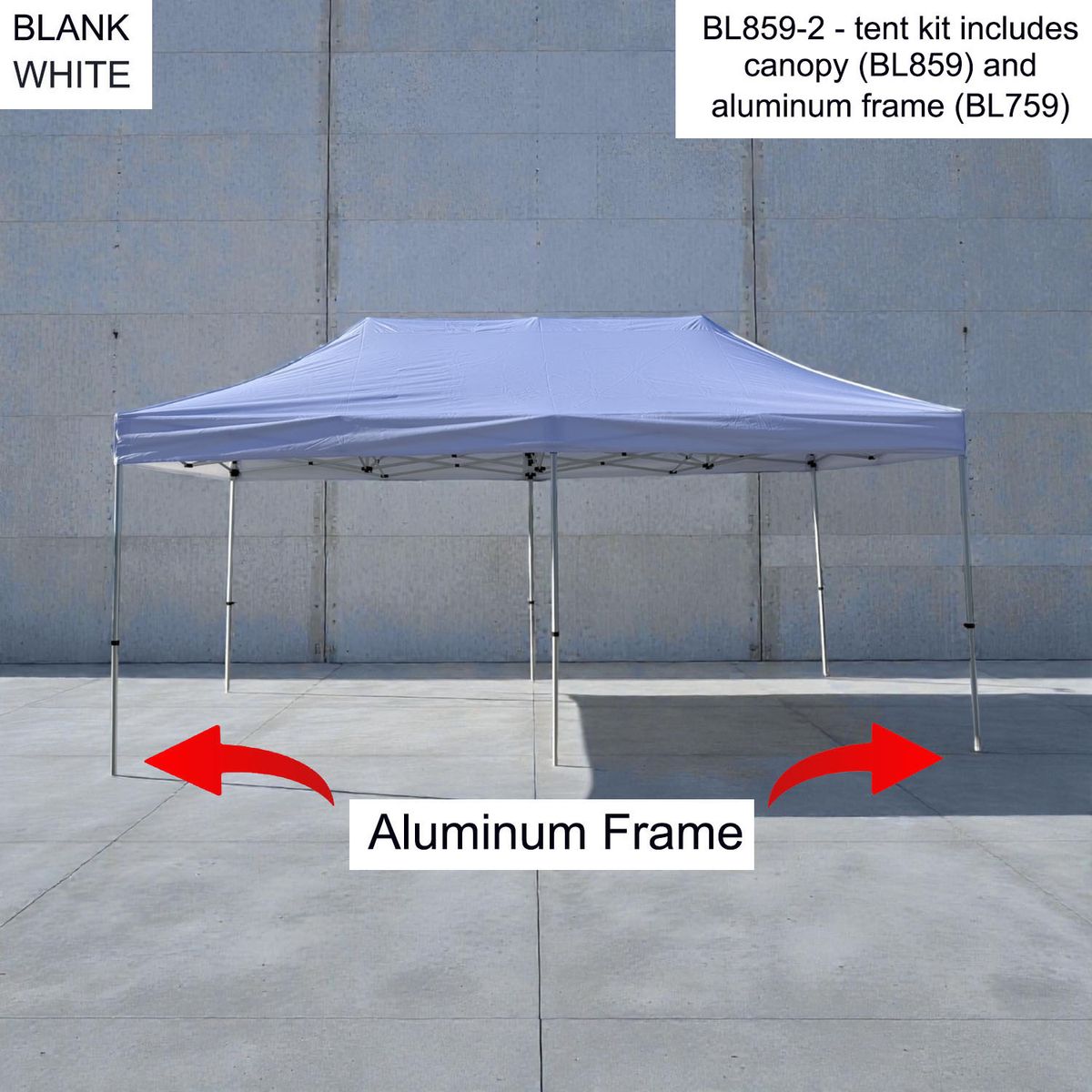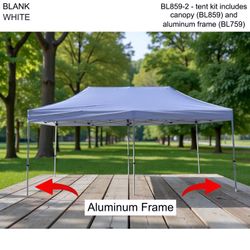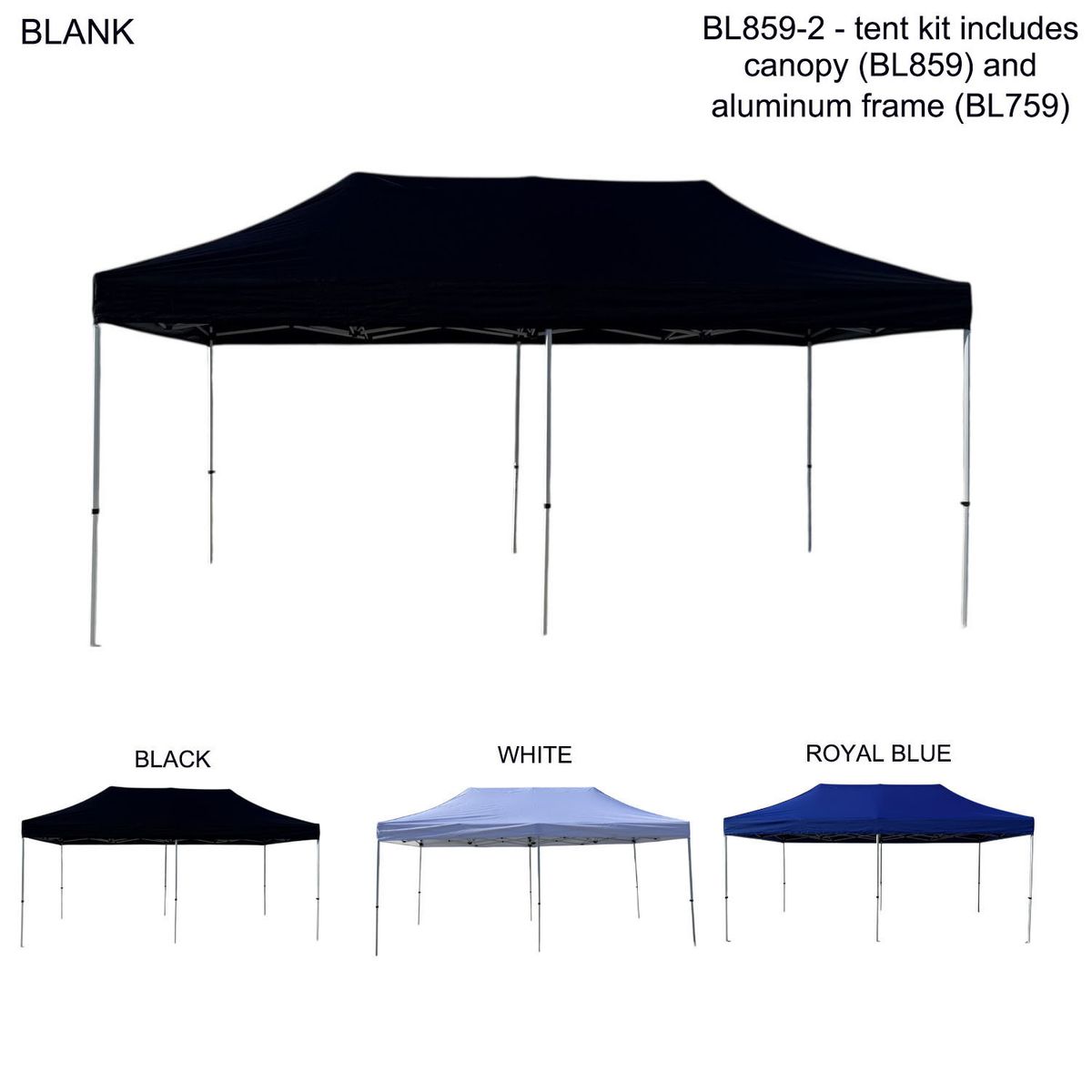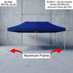- 20' x 10' heavy duty Tent canopy and Aluminum frame for more durability. Sold as blanks. Imported Canopy is stocked in 3 colors - black, blue, white.